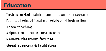 We can help with employee education through custom courses and seminars that are cost-effective and instructor-led custom courses and seminars. Educated people are up-to-date on the latest technologies and techniques, so that as a team they can be effective, innovative, and create competitive advantages.